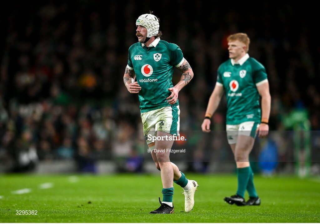 15 November 2025; Mack Hansen of Ireland during the Quilter Nations Series 2025 match between Ireland and Australia at the Aviva Stadium in Dublin. Photo by David Fitzgerald/Sportsfile