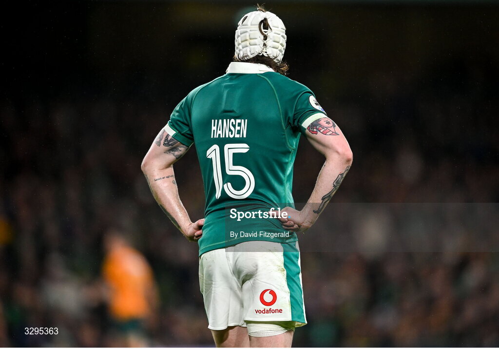 15 November 2025; Mack Hansen of Ireland during the Quilter Nations Series 2025 match between Ireland and Australia at the Aviva Stadium in Dublin. Photo by David Fitzgerald/Sportsfile