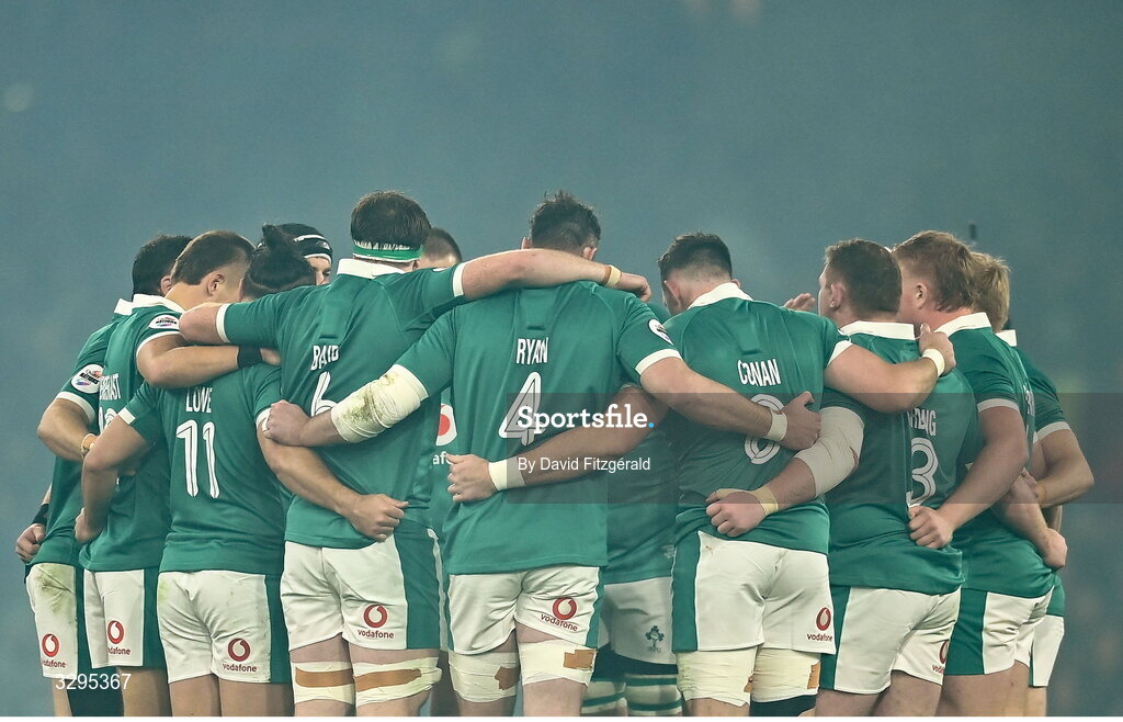 15 November 2025; Ireland huddle before the Quilter Nations Series 2025 match between Ireland and Australia at the Aviva Stadium in Dublin. Photo by David Fitzgerald/Sportsfile