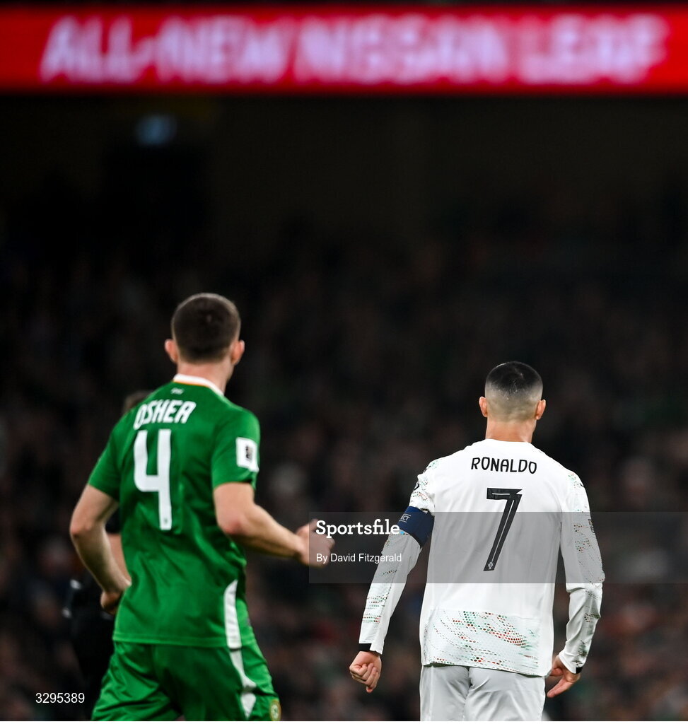 13 November 2025; Cristiano Ronaldo of Portugal and Dara O'Shea of Republic of Ireland during the FIFA World Cup 2026 Group F Qualifier match between Republic of Ireland and Portugal at the Aviva Stadium in Dublin. Photo by David Fitzgerald/Sportsfile
