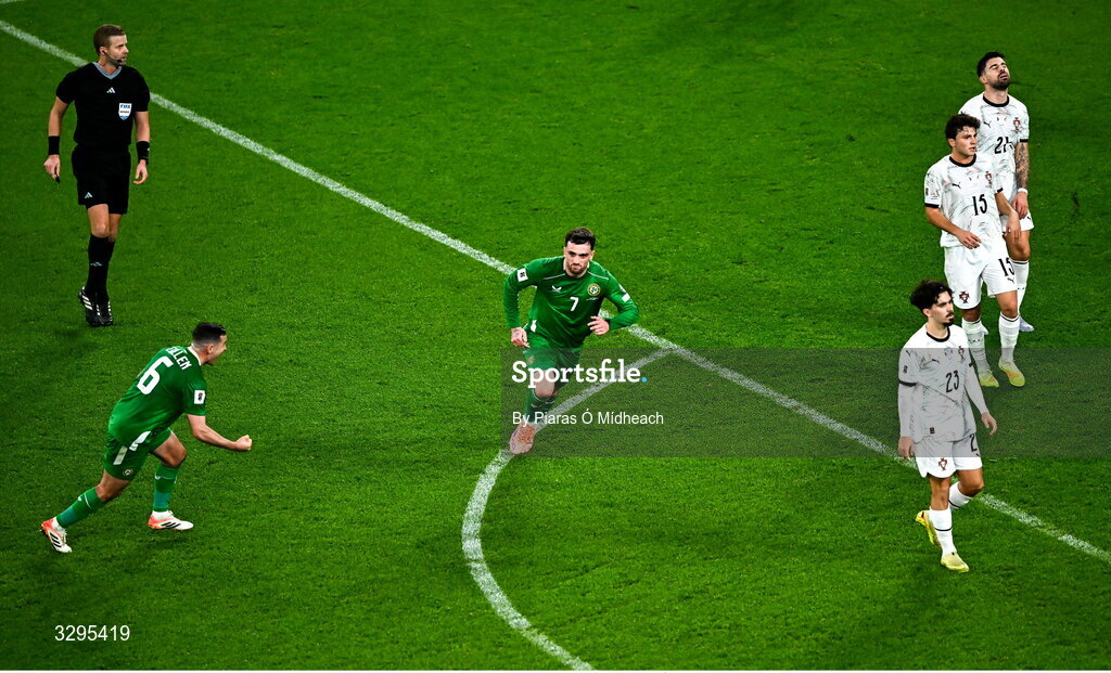 13 November 2025; Troy Parrott of Republic of Ireland, 7, celebrates scoring his side's second goal during the FIFA World Cup 2026 Group F Qualifier match between Republic of Ireland and Portugal at the Aviva Stadium in Dublin. Photo by Piaras Ó Mídheach/Sportsfile