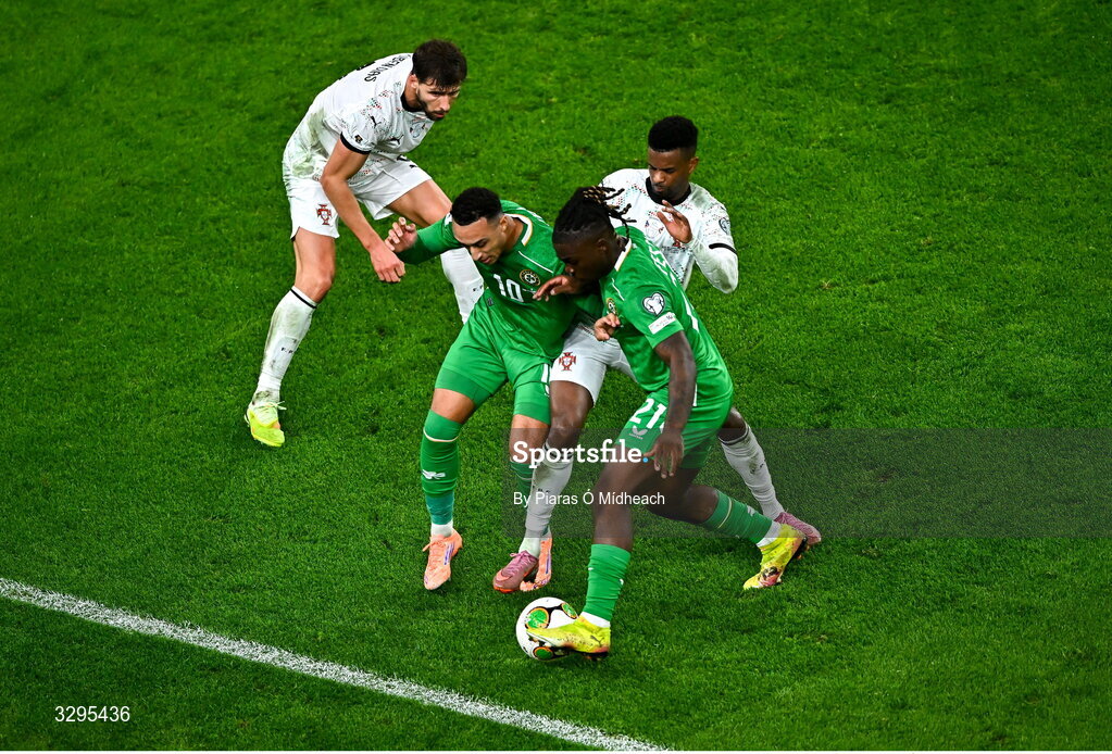 13 November 2025; Adam Idah, left, and Festy Ebosele of Republic of Ireland in action against Rúben Dias and Nélson Semedo, right, of Portugal during the FIFA World Cup 2026 Group F Qualifier match between Republic of Ireland and Portugal at the Aviva Stadium in Dublin. Photo by Piaras Ó Mídheach/Sportsfile