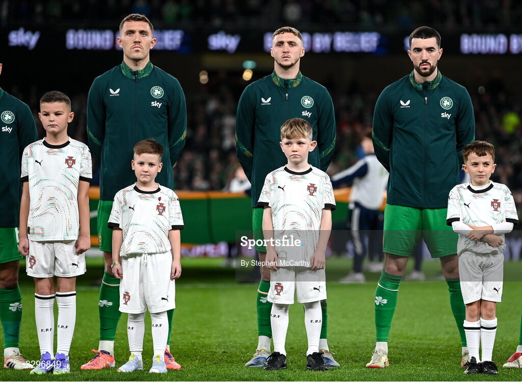 13 November 2025; Republic of Ireland players, from left, Dara O'Shea, Jack Taylor and Finn Azaz before the FIFA World Cup 2026 Group F Qualifier match between Republic of Ireland and Portugal at the Aviva Stadium in Dublin. Photo by Stephen McCarthy/Sportsfile