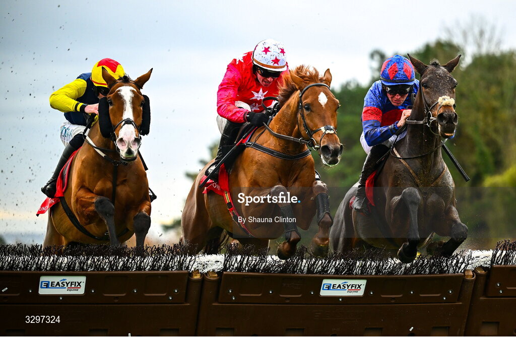 22 November 2025; Quinta Do Lago, with Donagh Meyler up, centre, alongside Ole Ole, with Keith Buckley up, right, who finished second, and Combs, with Jack Kennedy up, who finished third, jumps the last on their way to winning the Total Event Rental 3-Y-O Maiden Hurdle during day one of the Punchestown Premiere Weekend at Punchestown Racecourse in Kildare. Photo by Shauna Clinton/Sportsfile