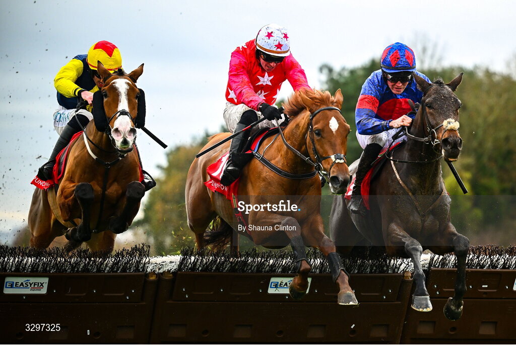 22 November 2025; Quinta Do Lago, with Donagh Meyler up, centre, alongside Ole Ole, with Keith Buckley up, right, who finished second, and Combs, with Jack Kennedy up, who finished third, jumps the last on their way to winning the Total Event Rental 3-Y-O Maiden Hurdle during day one of the Punchestown Premiere Weekend at Punchestown Racecourse in Kildare. Photo by Shauna Clinton/Sportsfile