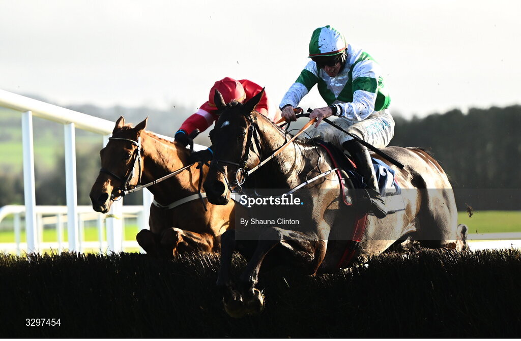 22 November 2025; Dee Capo, with Jack Kennedy up, right, alongside High Class Hero, with Paul Townend up, who finished second, jumps the last on their way to winning the Ryans Cleaning Handicap Steeplechase during day one of the Punchestown Premiere Weekend at Punchestown Racecourse in Kildare. Photo by Shauna Clinton/Sportsfile