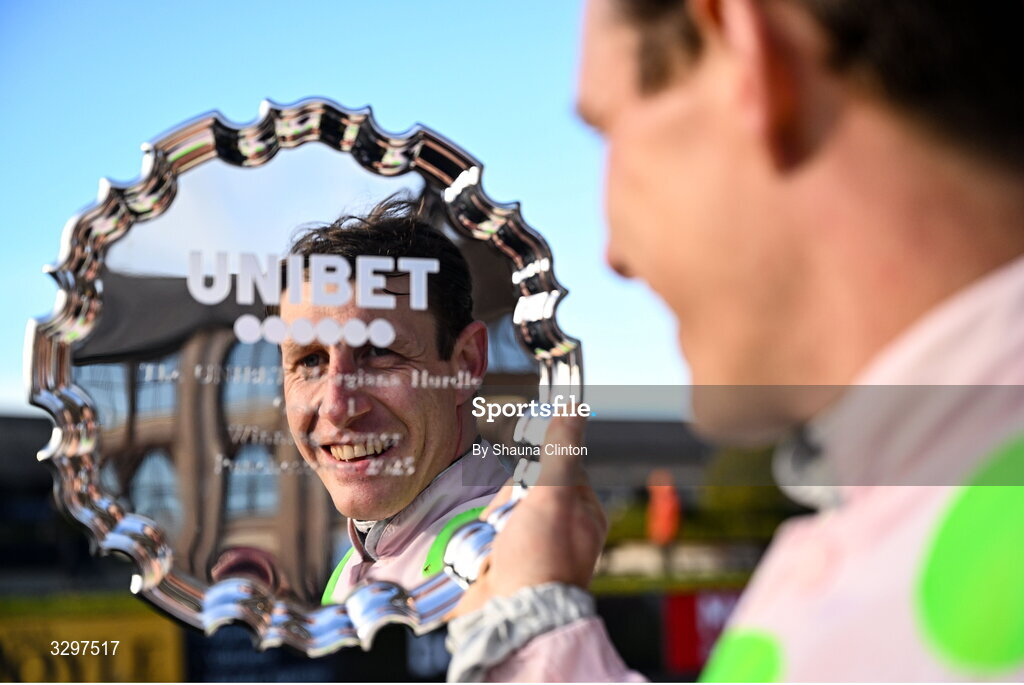 22 November 2025; Paul Townend celebrates after winning the Unibet Morgiana Hurdle on Lossiemouth during day one of the Punchestown Premiere Weekend at Punchestown Racecourse in Kildare. Photo by Shauna Clinton/Sportsfile
