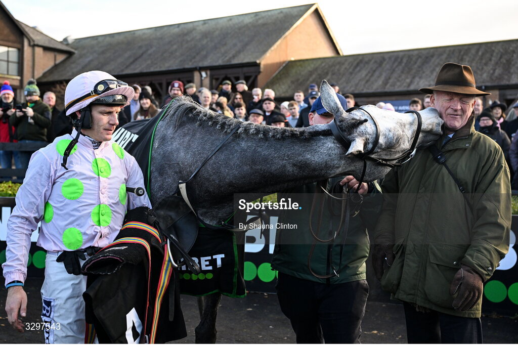 22 November 2025; Trainer Willie Mullins gets a nip from Lossiemouth after winning the Unibet Morgiana Hurdle during day one of the Punchestown Premiere Weekend at Punchestown Racecourse in Kildare. Photo by Shauna Clinton/Sportsfile