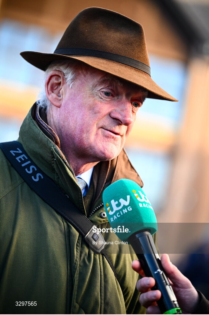 22 November 2025; Trainer Willie Mullins is interviewed after sending Lossiemouth out to win the Unibet Morgiana Hurdle during day one of the Punchestown Premiere Weekend at Punchestown Racecourse in Kildare. Photo by Shauna Clinton/Sportsfile