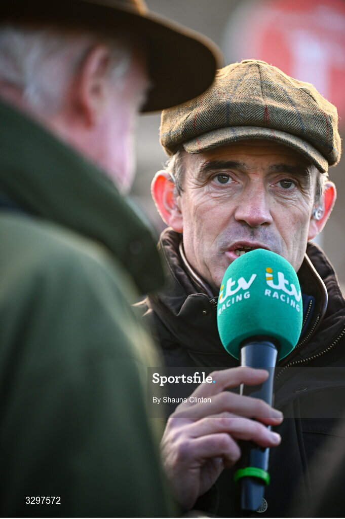 22 November 2025; Former jockey Ruby Walsh interviews trainer Willie Mullins after he sent Lossiemouth out to win the Unibet Morgiana Hurdle during day one of the Punchestown Premiere Weekend at Punchestown Racecourse in Kildare. Photo by Shauna Clinton/Sportsfile