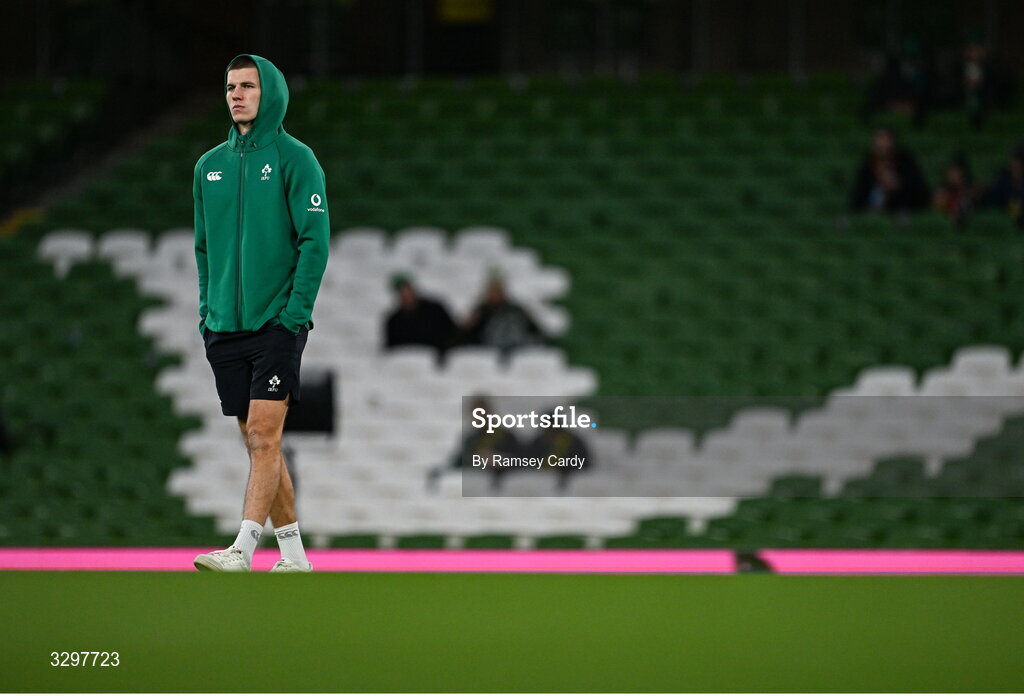 22 November 2025; Sam Prendergast of Ireland before the Quilter Nations Series 2025 match between Ireland and South Africa at the Aviva Stadium in Dublin. Photo by Ramsey Cardy/Sportsfile