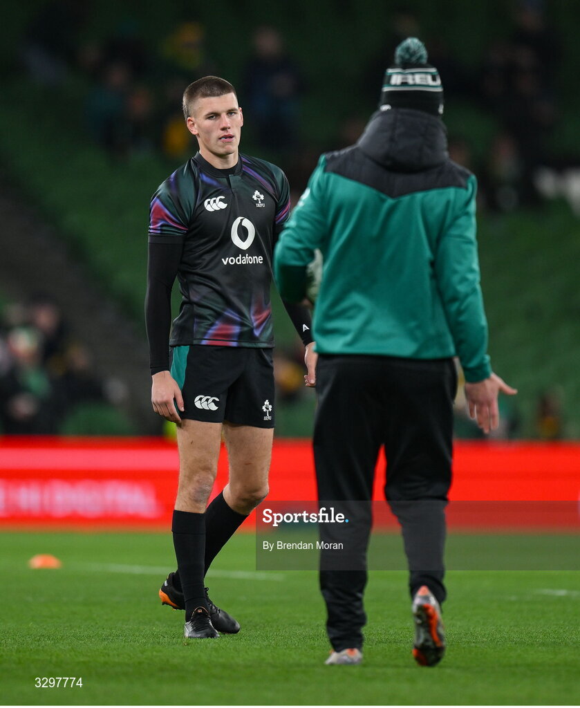 22 November 2025; Sam Prendergast of Ireland before the Quilter Nations Series 2025 match between Ireland and South Africa at the Aviva Stadium in Dublin. Photo by Brendan Moran/Sportsfile
