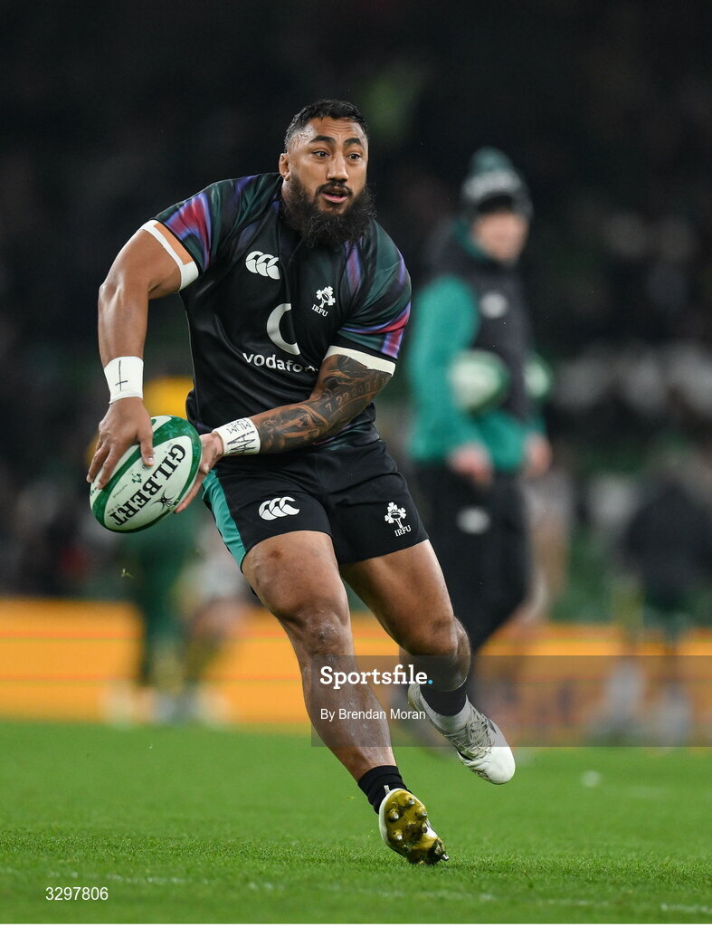 22 November 2025; Bundee Aki of Ireland before the Quilter Nations Series 2025 match between Ireland and South Africa at the Aviva Stadium in Dublin. Photo by Brendan Moran/Sportsfile