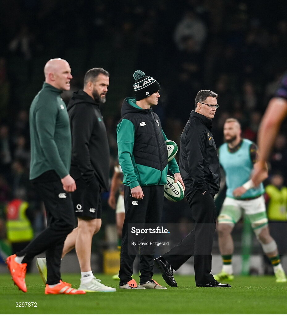 22 November 2025; Ireland forwards coach Paul O'Connell, left, Ireland head coach Andy Farrell, second from left, Ireland assistant coach Jonathan Sexton, third from left, and South Africa head coach Rassie Erasmus before the Quilter Nations Series 2025 match between Ireland and South Africa at the Aviva Stadium in Dublin. Photo by David Fitzgerald/Sportsfile