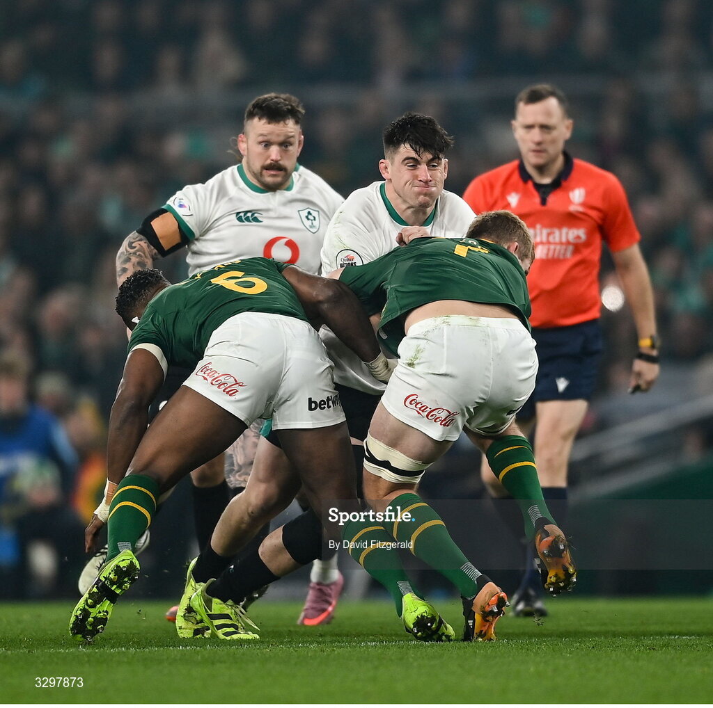 22 November 2025; Dan Sheehan of Ireland is tackled by Siya Kolisi, left, and Pieter-Steph du Toit of South Africa during the Quilter Nations Series 2025 match between Ireland and South Africa at the Aviva Stadium in Dublin. Photo by David Fitzgerald/Sportsfile