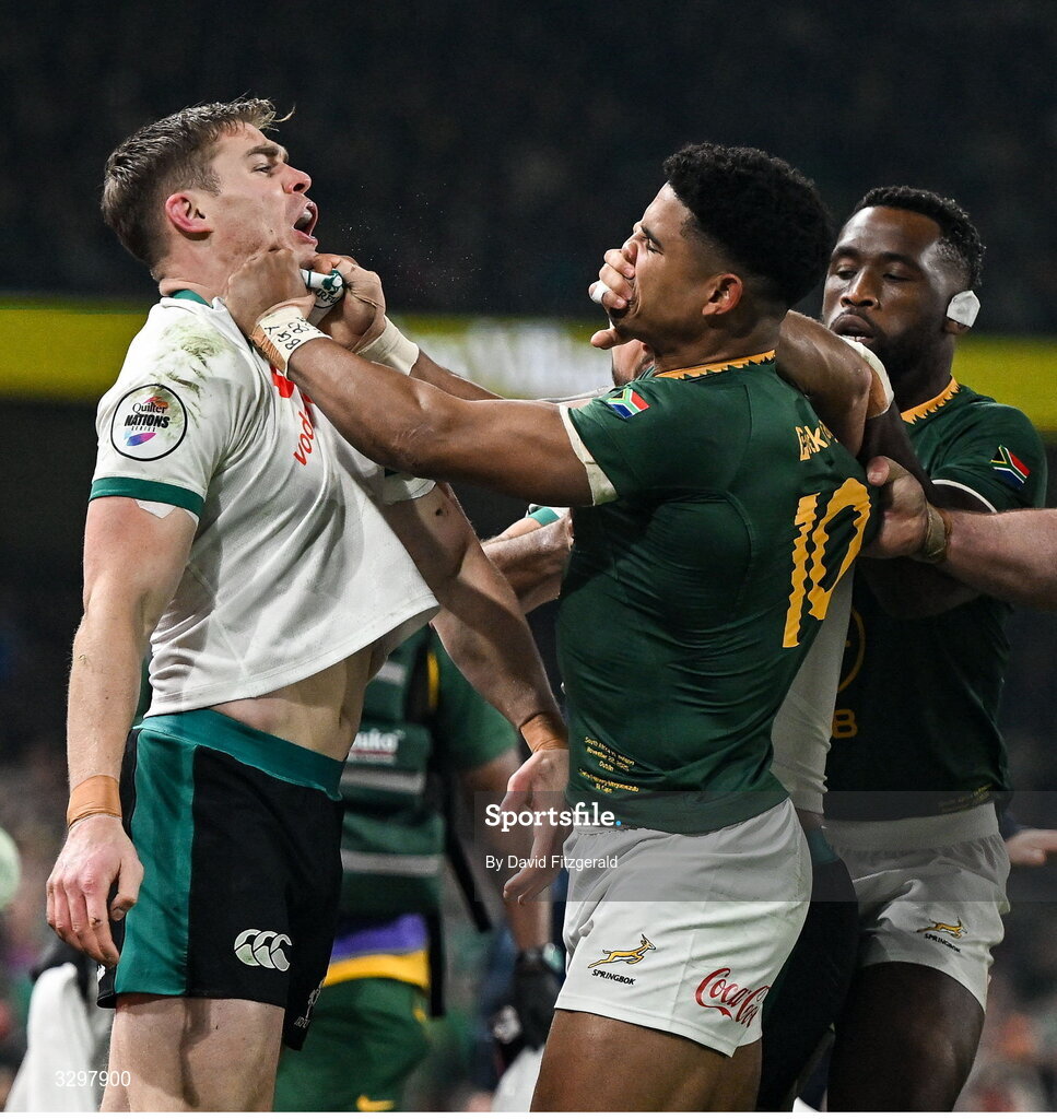 22 November 2025; Garry Ringrose of Ireland and Sacha Feinberg-Mngomezulu of South Africa tussle during the Quilter Nations Series 2025 match between Ireland and South Africa at the Aviva Stadium in Dublin. Photo by David Fitzgerald/Sportsfile