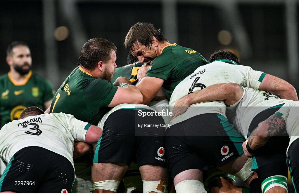 22 November 2025; Eben Etzebeth, right, and Boan Venter of South Africa during the Quilter Nations Series 2025 match between Ireland and South Africa at the Aviva Stadium in Dublin. Photo by Ramsey Cardy/Sportsfile
