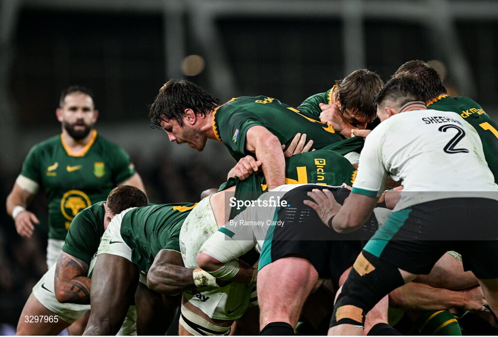 22 November 2025; Ruan Nortje of South Africa, centre, during the Quilter Nations Series 2025 match between Ireland and South Africa at the Aviva Stadium in Dublin. Photo by Ramsey Cardy/Sportsfile