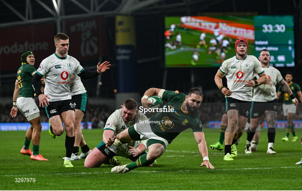 22 November 2025; Cobus Reinach of South Africa dives over to score his side's second try during the Quilter Nations Series 2025 match between Ireland and South Africa at the Aviva Stadium in Dublin. Photo by Ramsey Cardy/Sportsfile