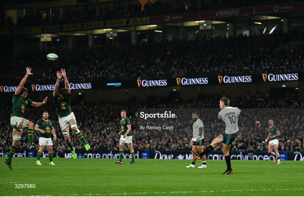 22 November 2025; Sam Prendergast of Ireland in action against Eben Etzebeth, left, and Ruan Nortje of South Africa during the Quilter Nations Series 2025 match between Ireland and South Africa at the Aviva Stadium in Dublin. Photo by Ramsey Cardy/Sportsfile