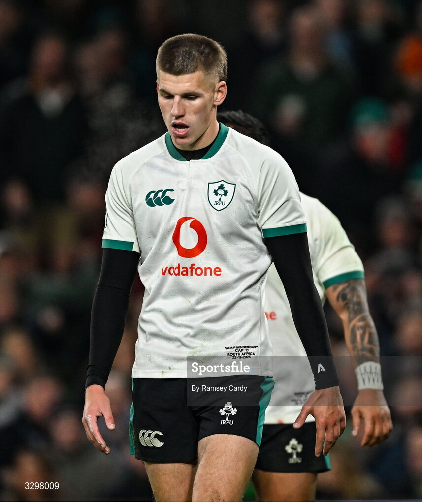 22 November 2025; Sam Prendergast of Ireland during the Quilter Nations Series 2025 match between Ireland and South Africa at the Aviva Stadium in Dublin. Photo by Ramsey Cardy/Sportsfile