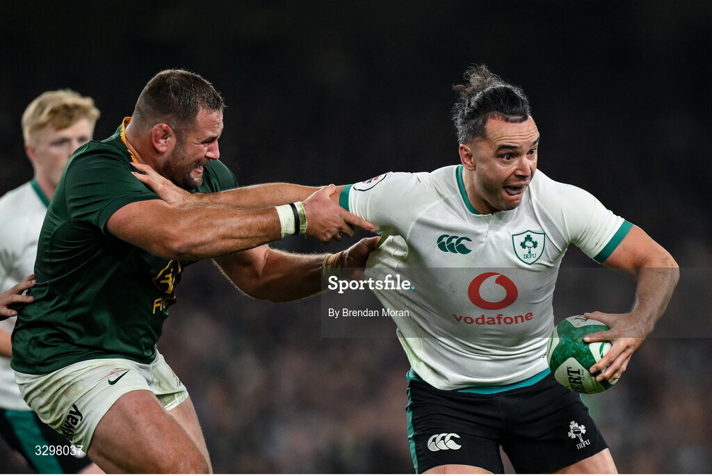 22 November 2025; James Lowe of Ireland in action against Thomas du Toit of South Africa during the Quilter Nations Series 2025 match between Ireland and South Africa at the Aviva Stadium in Dublin. Photo by Brendan Moran/Sportsfile