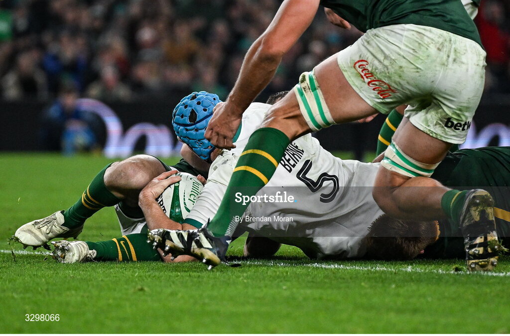 22 November 2025; Tadhg Beirne of Ireland dives over to score his side's first try which was subsequently disallowed during the Quilter Nations Series 2025 match between Ireland and South Africa at the Aviva Stadium in Dublin. Photo by Brendan Moran/Sportsfile