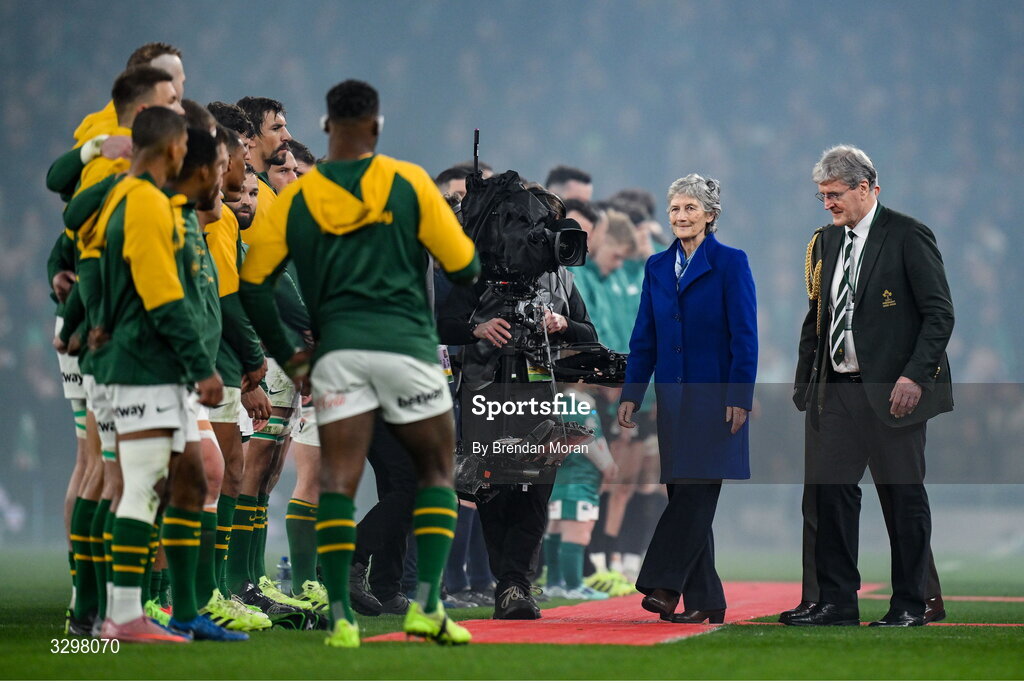 22 November 2025; President of Ireland Catherine Connolly and IRFU President John O'Driscoll walk out to meet the teams before the Quilter Nations Series 2025 match between Ireland and South Africa at the Aviva Stadium in Dublin. Photo by Brendan Moran/Sportsfile