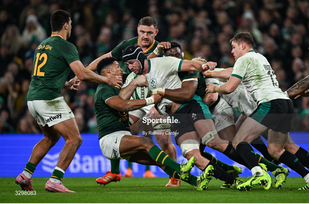 22 November 2025; Caelan Doris of Ireland is tackled by Sacha Feinberg-Mngomezulu, left, and Siya Kolisi of South Africa during the Quilter Nations Series 2025 match between Ireland and South Africa at the Aviva Stadium in Dublin. Photo by Ramsey Cardy/Sportsfile