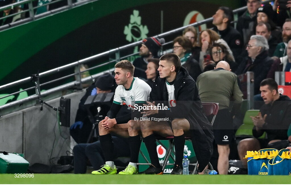22 November 2025; Jack Crowley, left, and Sam Prendergast of Ireland sit on the bench after both recieved yellow cards during the Quilter Nations Series 2025 match between Ireland and South Africa at the Aviva Stadium in Dublin. Photo by David Fitzgerald/Sportsfile
