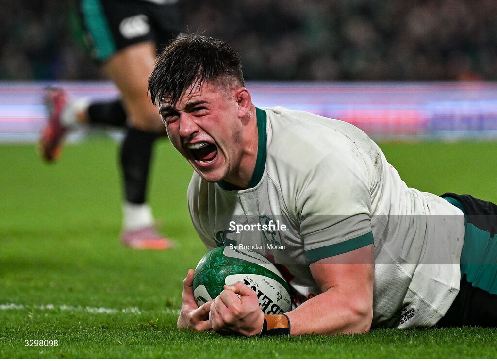 22 November 2025; Dan Sheehan of Ireland celebrates after scoring his side's first try during the Quilter Nations Series 2025 match between Ireland and South Africa at the Aviva Stadium in Dublin. Photo by Brendan Moran/Sportsfile