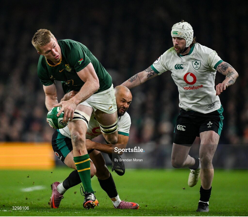 22 November 2025; Pieter-Steph du Toit of South Africa is tackled by Jamison Gibson-Park, left, and Mack Hansen of Ireland during the Quilter Nations Series 2025 match between Ireland and South Africa at the Aviva Stadium in Dublin. Photo by Brendan Moran/Sportsfile