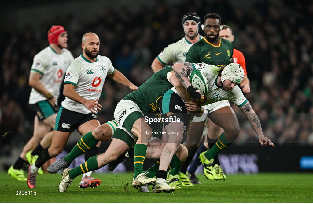 22 November 2025; Mack Hansen of Ireland is tackled by Cobus Reinach of South Africa during the Quilter Nations Series 2025 match between Ireland and South Africa at the Aviva Stadium in Dublin. Photo by Ramsey Cardy/Sportsfile
