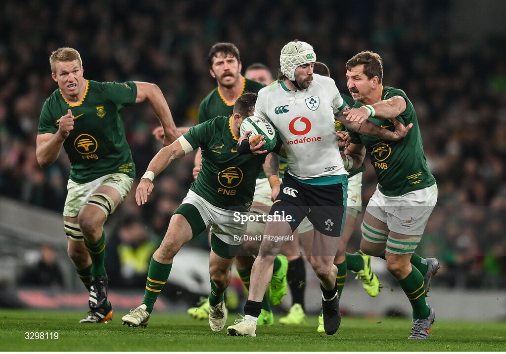 22 November 2025; Mack Hansen of Ireland is tackled by Ruan Nortje of South Africa during the Quilter Nations Series 2025 match between Ireland and South Africa at the Aviva Stadium in Dublin. Photo by David Fitzgerald/Sportsfile