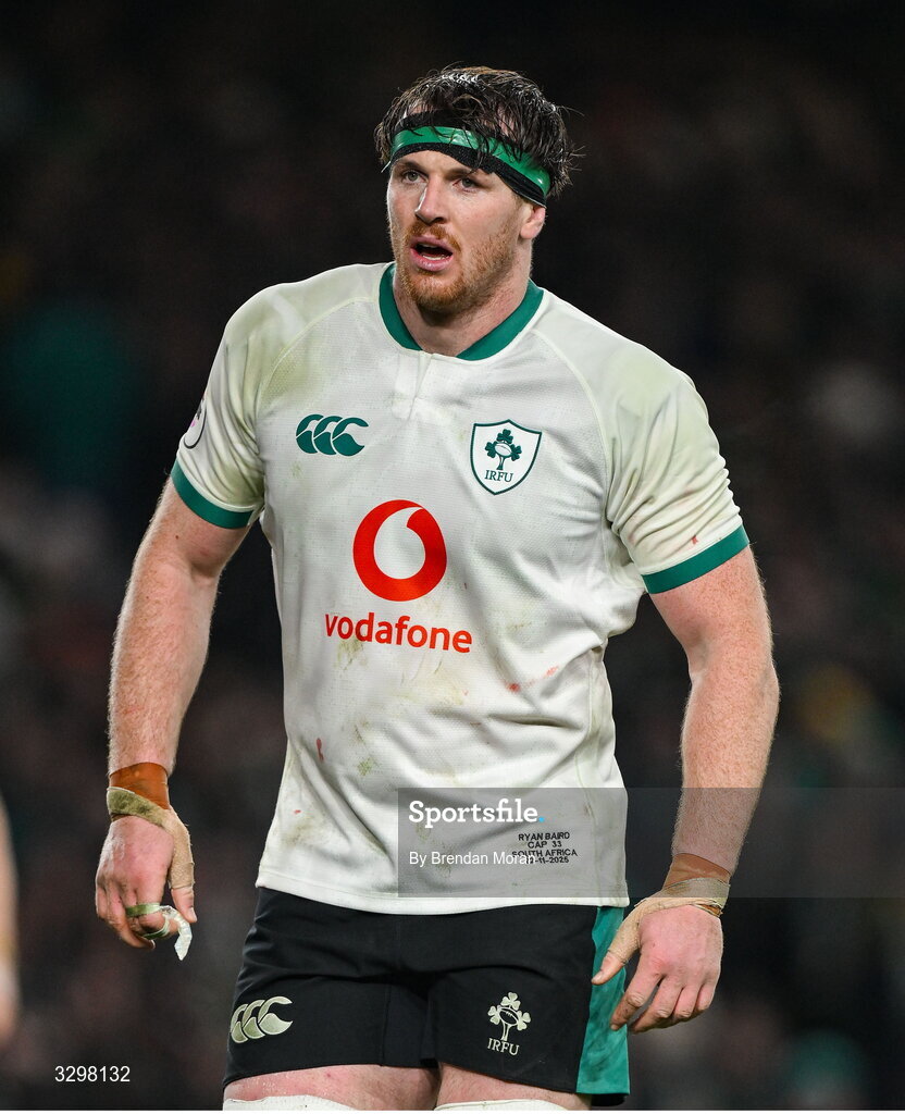 22 November 2025; Ryan Baird of Ireland leaves the pitch after sustaining an injury during the Quilter Nations Series 2025 match between Ireland and South Africa at the Aviva Stadium in Dublin. Photo by Brendan Moran/Sportsfile