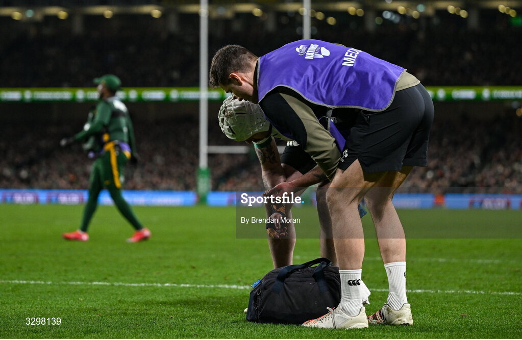 22 November 2025; Mack Hansen of Ireland recieves medical attention during the Quilter Nations Series 2025 match between Ireland and South Africa at the Aviva Stadium in Dublin. Photo by Brendan Moran/Sportsfile