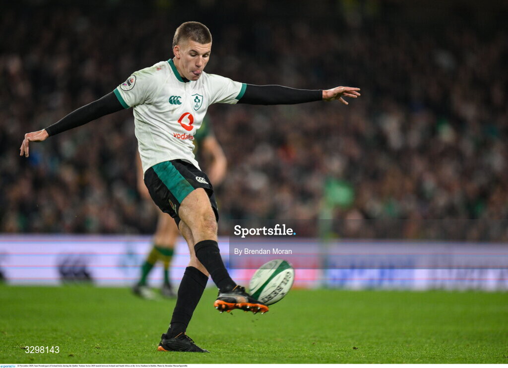 22 November 2025; Sam Prendergast of Ireland kicks during the Quilter Nations Series 2025 match between Ireland and South Africa at the Aviva Stadium in Dublin. Photo by Brendan Moran/Sportsfile