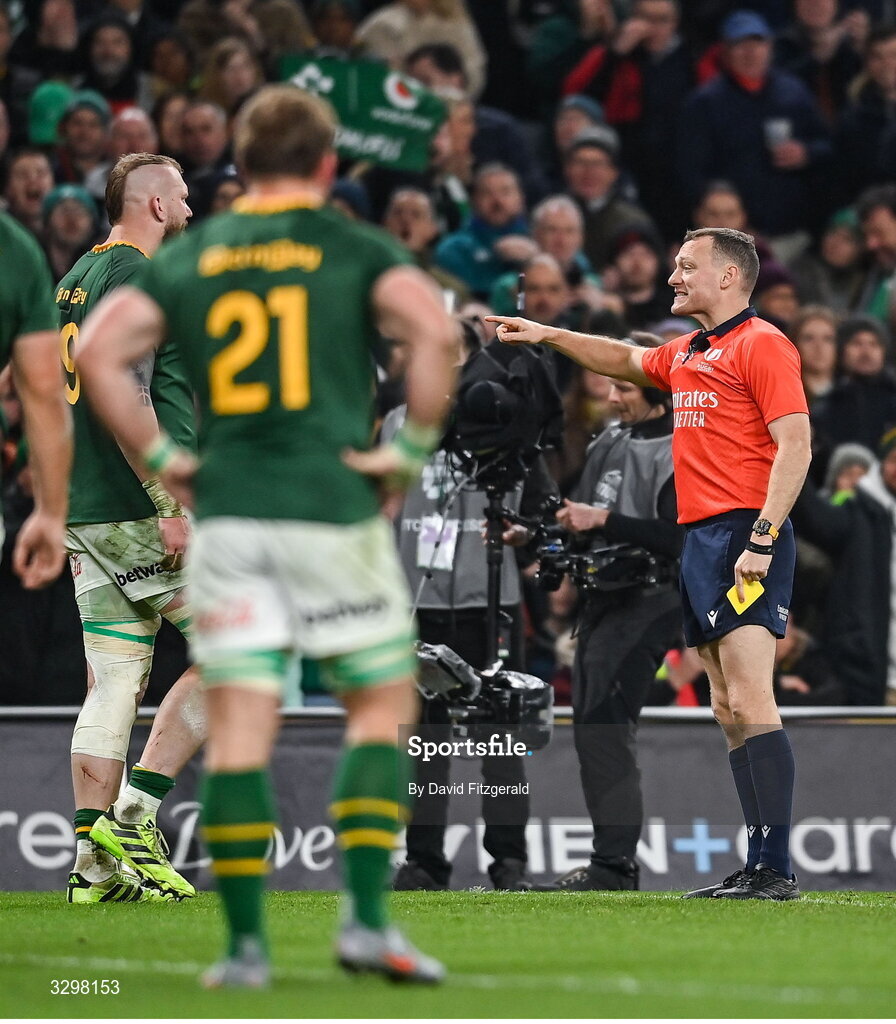 22 November 2025; Referee Matthew Carley shows a yellow card to RG Snyman of South Africa during the Quilter Nations Series 2025 match between Ireland and South Africa at the Aviva Stadium in Dublin. Photo by David Fitzgerald/Sportsfile