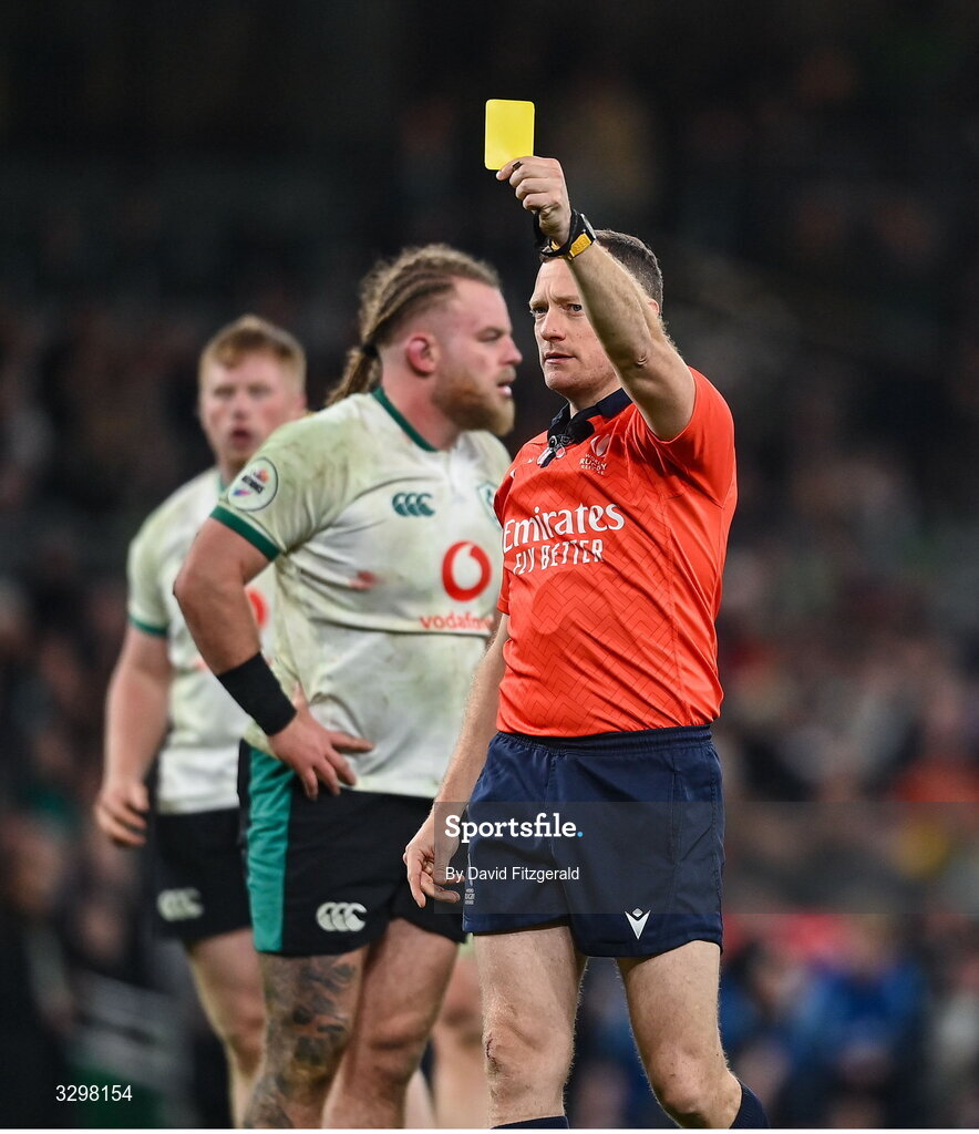22 November 2025; Referee Matthew Carley shows a yellow card to Grant Williams of South Africa, not pictured, during the Quilter Nations Series 2025 match between Ireland and South Africa at the Aviva Stadium in Dublin. Photo by David Fitzgerald/Sportsfile