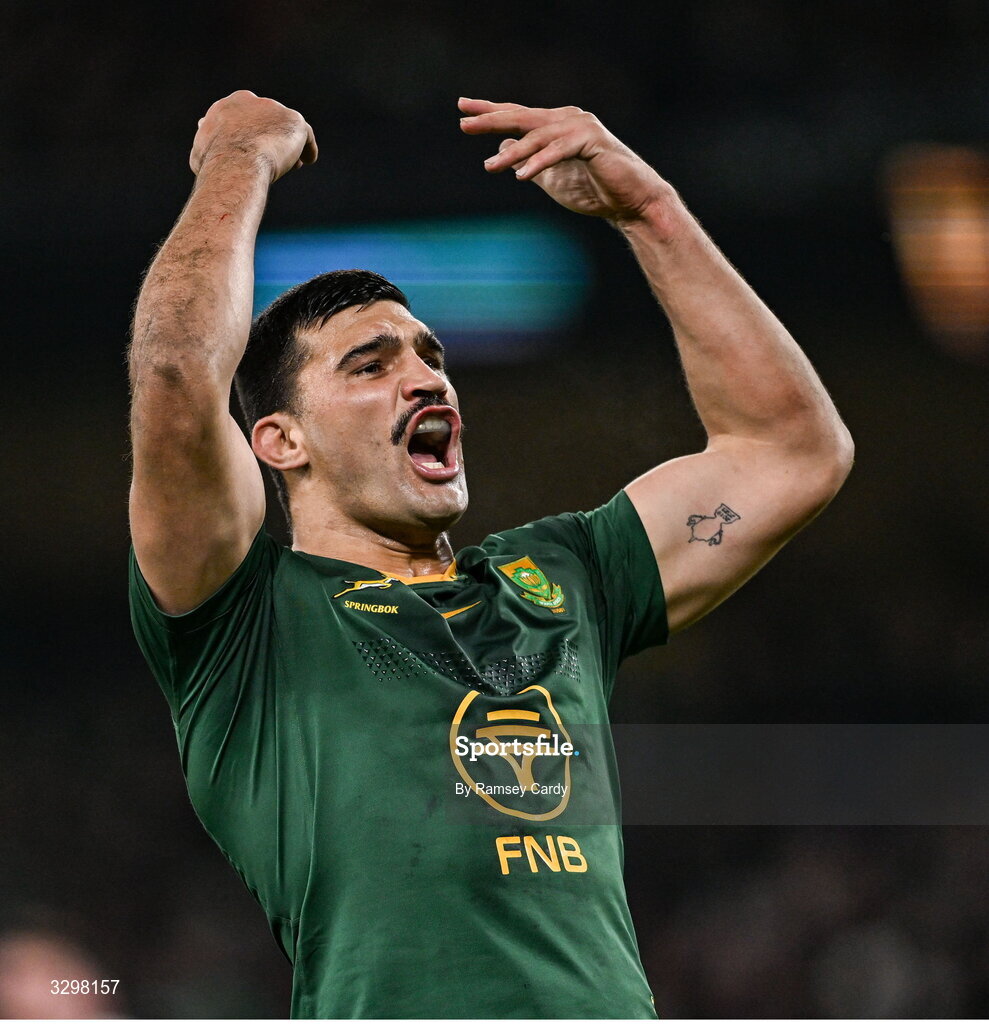 22 November 2025; Damian de Allende of South Africa celebrates during the Quilter Nations Series 2025 match between Ireland and South Africa at the Aviva Stadium in Dublin. Photo by Ramsey Cardy/Sportsfile