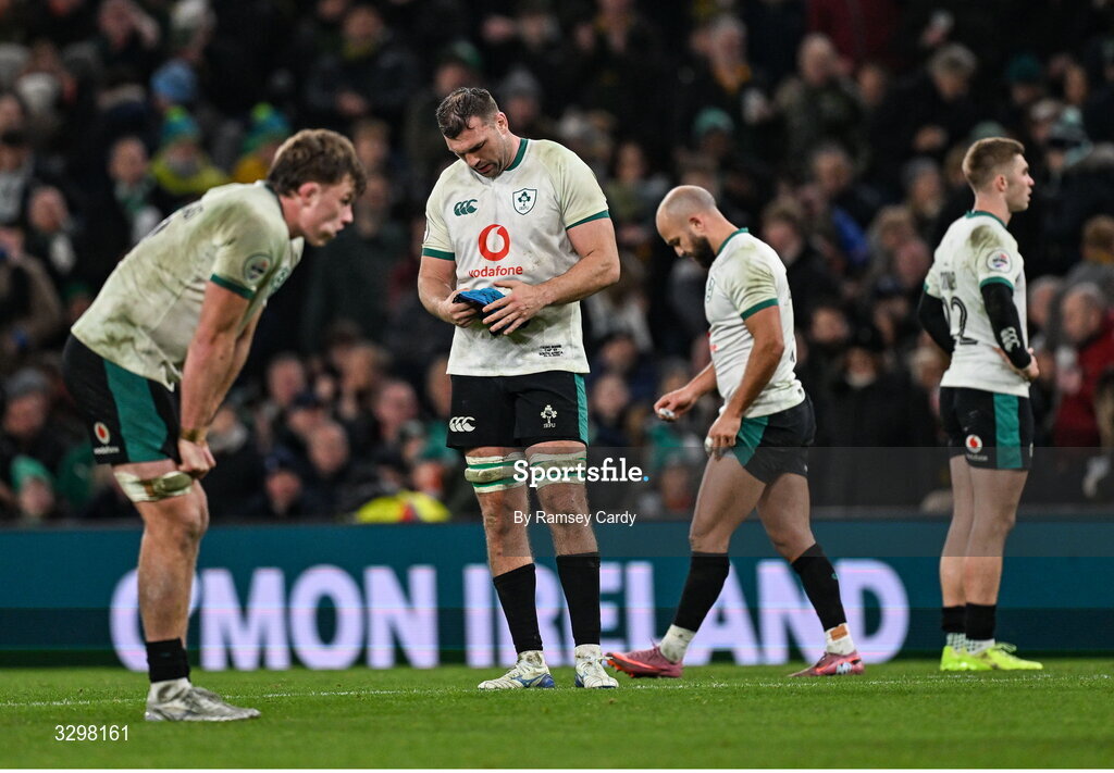 22 November 2025; Tadhg Beirne of Ireland, centre, and teammates react after the Quilter Nations Series 2025 match between Ireland and South Africa at the Aviva Stadium in Dublin. Photo by Ramsey Cardy/Sportsfile