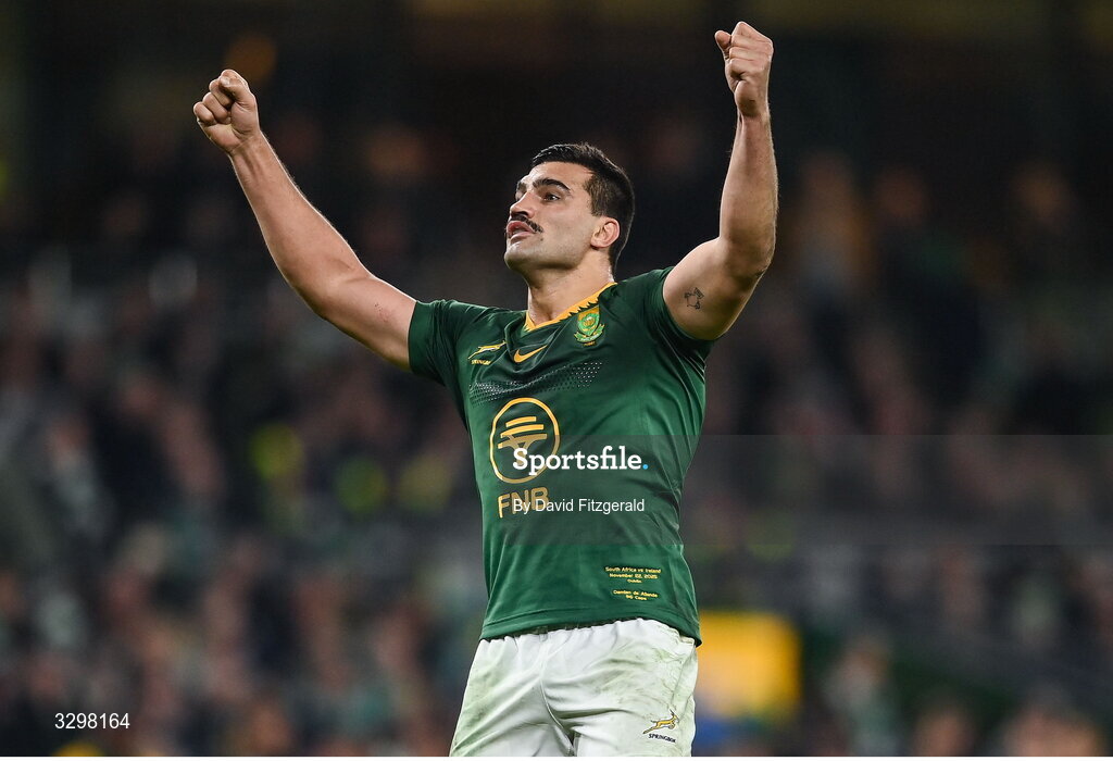 22 November 2025; Damian de Allende of South Africa celebrates after the Quilter Nations Series 2025 match between Ireland and South Africa at the Aviva Stadium in Dublin. Photo by David Fitzgerald/Sportsfile