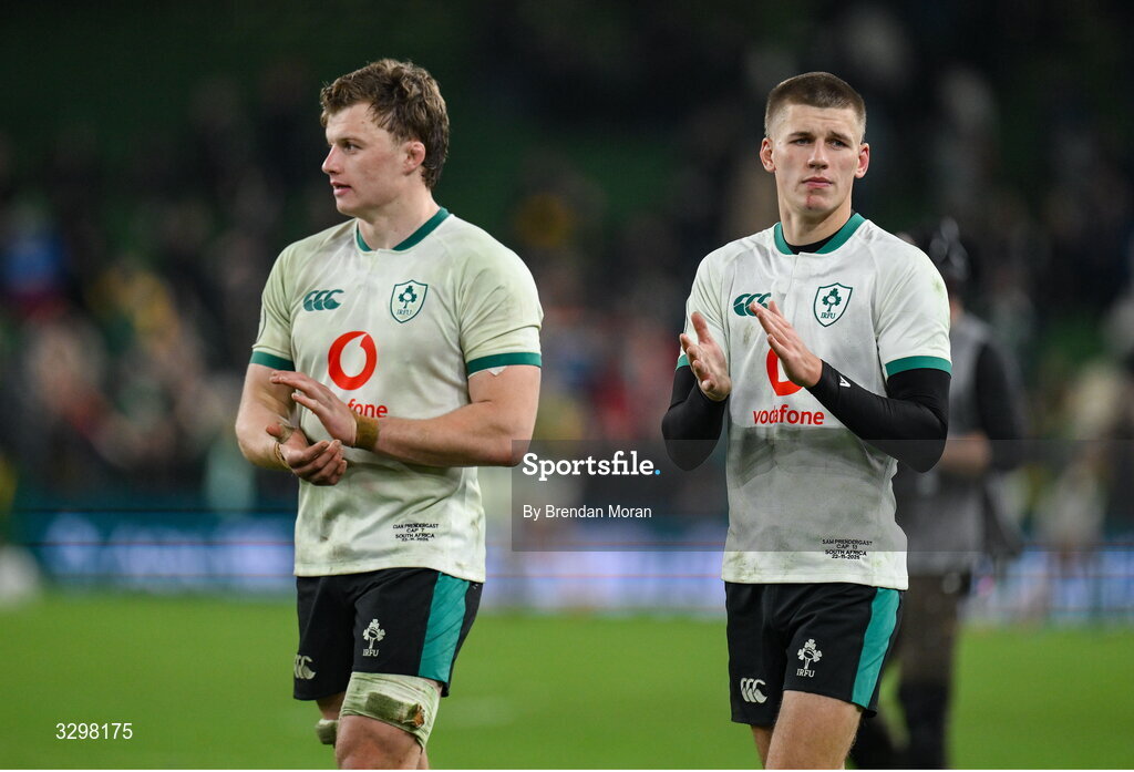 22 November 2025; Sam Prendergast, right, and Cian Prendergast of Ireland during the Quilter Nations Series 2025 match between Ireland and South Africa at the Aviva Stadium in Dublin. Photo by Brendan Moran/Sportsfile
