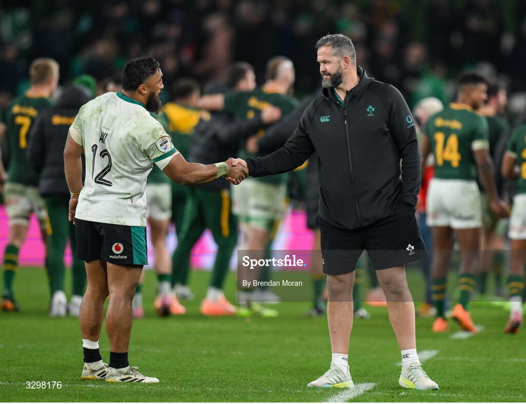 22 November 2025; Ireland head coach Andy Farrell and Bundee Aki of Ireland after the Quilter Nations Series 2025 match between Ireland and South Africa at the Aviva Stadium in Dublin. Photo by Brendan Moran/Sportsfile