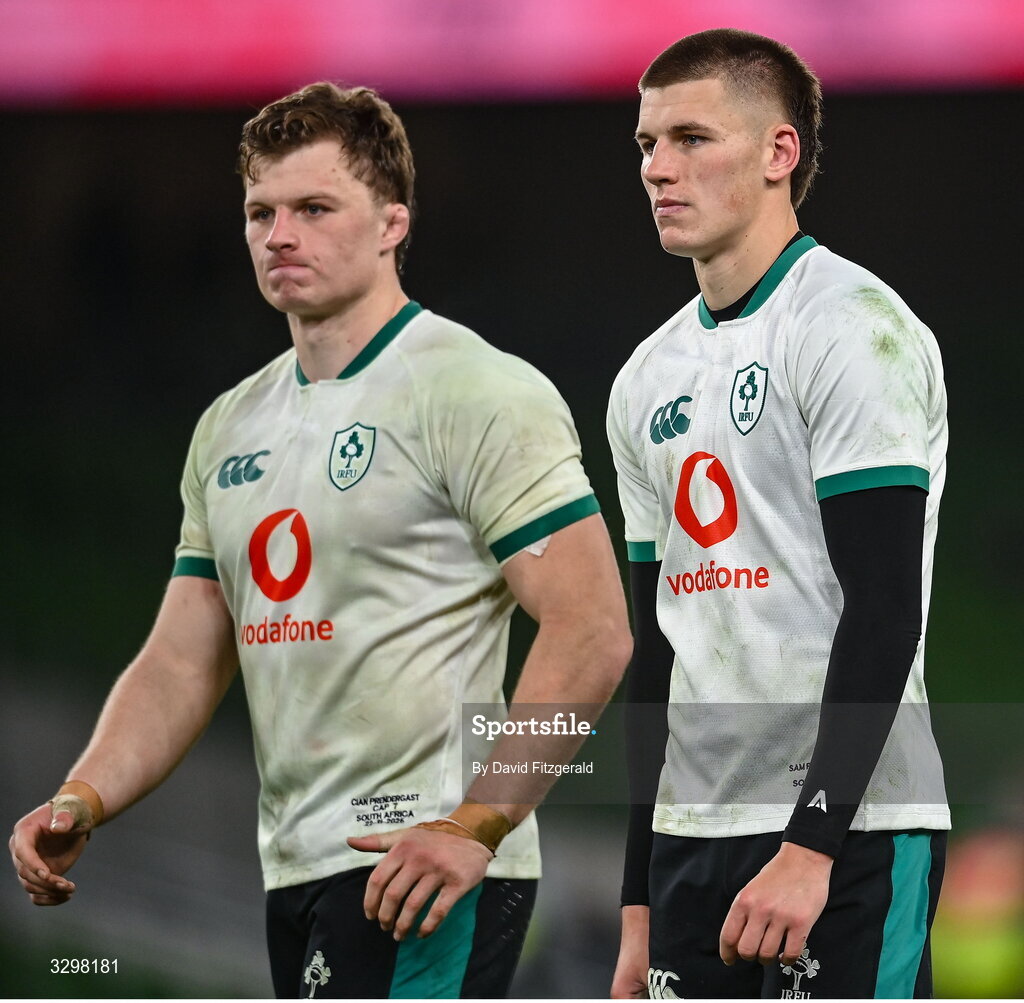 22 November 2025; Sam Prendergast, right, and Cian Prendergast of Ireland after the Quilter Nations Series 2025 match between Ireland and South Africa at the Aviva Stadium in Dublin. Photo by David Fitzgerald/Sportsfile