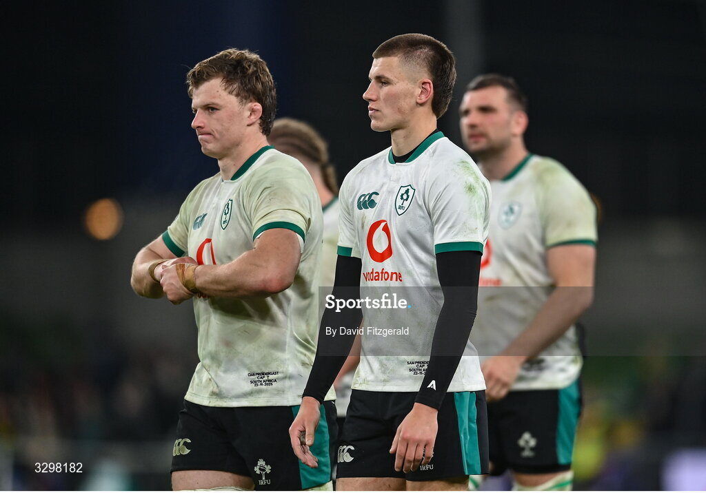 22 November 2025; Sam Prendergast, right, and Cian Prendergast of Ireland after the Quilter Nations Series 2025 match between Ireland and South Africa at the Aviva Stadium in Dublin. Photo by David Fitzgerald/Sportsfile