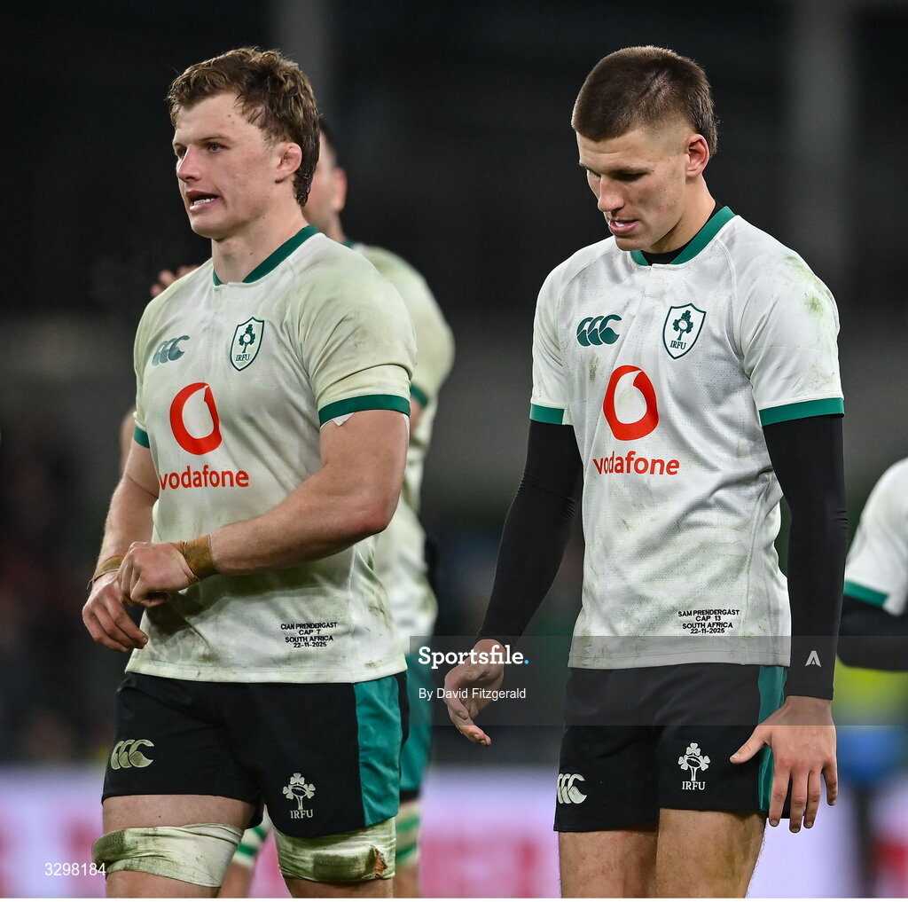 22 November 2025; Sam Prendergast, right, and Cian Prendergast of Ireland after the Quilter Nations Series 2025 match between Ireland and South Africa at the Aviva Stadium in Dublin. Photo by David Fitzgerald/Sportsfile