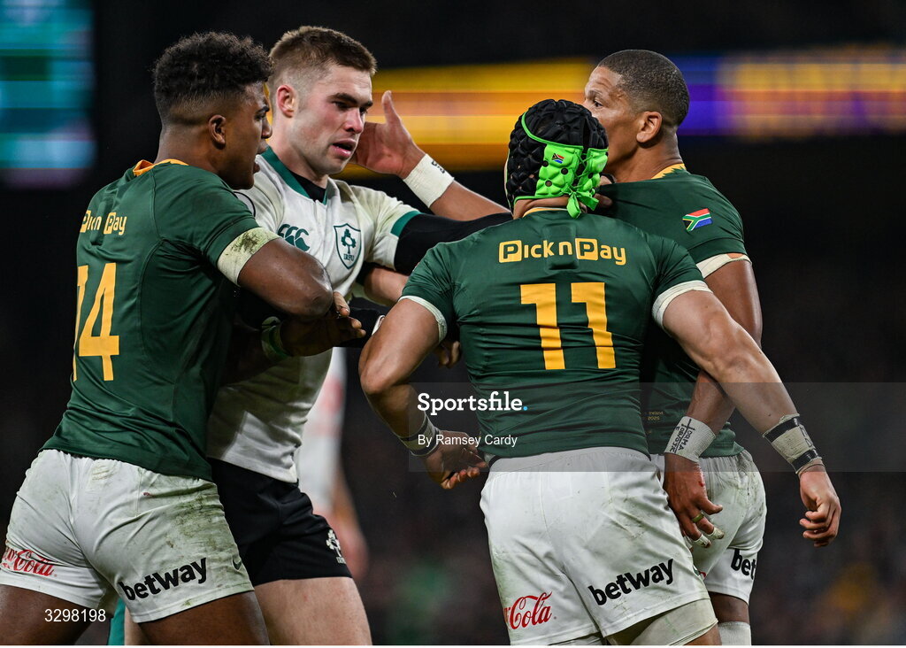 22 November 2025; Jack Crowley of Ireland tussles with South Africa players, from left, Canan Moodie, Cheslin Kolbe and Manie Libbok during the Quilter Nations Series 2025 match between Ireland and South Africa at the Aviva Stadium in Dublin. Photo by Ramsey Cardy/Sportsfile