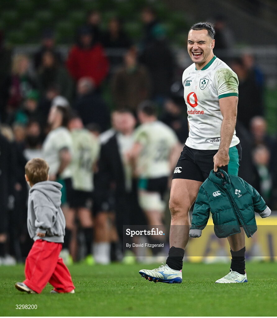 22 November 2025; James Lowe of Ireland and his son Nico after the Quilter Nations Series 2025 match between Ireland and South Africa at the Aviva Stadium in Dublin. Photo by David Fitzgerald/Sportsfile