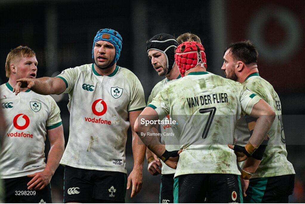 22 November 2025; Ireland players, from left, Paddy McCarthy, Tadhg Beirne, Caelan Doris, Josh van der Flier and Rónan Kelleher after the Quilter Nations Series 2025 match between Ireland and South Africa at the Aviva Stadium in Dublin. Photo by Ramsey Cardy/Sportsfile